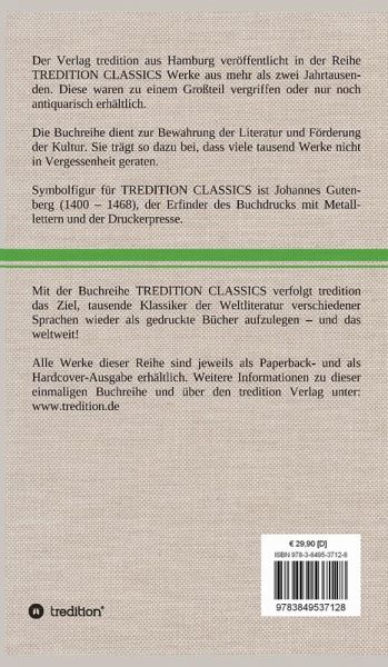 Diese Hardcover-Ausgabe ist Teil der TREDITION CLASSICS. Der Verlag tredition aus Hamburg veröffentlicht in der Buchreihe TREDITION CLASSICS Werke aus mehr als zwei Jahrtausenden. Diese waren zu einem Großteil vergriffen oder nur noch antiquarisch erhältlich. Mit TREDITION CLASSICS verfolgt tredition das Ziel, tausende Klassiker der Weltliteratur verschiedener Sprachen wieder als gedruckte Bücher zu verlegen und das weltweit! Die Buchreihe dient zur Bewahrung der Literatur und Förderung der Kultur. Sie trägt so dazu bei, dass viele tausend Werke nicht in Vergessenheit geraten.