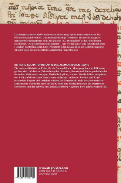 Das Hermetschwiler Gebetbuch, das heute im Sarner Benediktinerkollegium, einem Priorat der Abtei Muri-Gries als Cod. Chart. 208 aufbewahrt wird, birgt einen bemerkenswerten, thematisch wie funktional heterogenen Textbestand: Heilsegen sind ebenso Bestandteil dieses Gebetbuches wie Andachten und Gebete. Die stark abgenutzte Handschrift, die in den ersten beiden Jahrzehnten des 15. Jahrhunderts in der heutigen Deutschschweiz (Aargau) entstanden ist, wird hier erstmals umfassend erschlossen. Zur Edition der größtenteils unbekannten Texte tritt eine Kontextualisierung hinsichtlich ihrer Funktion. Eine bibliothekshistorische Untersuchung der vorwiegend bürgerlich geprägten Beziehungsnetze im südalemannischen Raum ermöglicht einen vertieften Einblick in den Sarner Gebetbuchbestand, einen der größten geschlossenen Gebetbuchbestände der heutigen Schweiz. Daraus ergeben sich neue Einsichten in Gebetspraxis und Alltagswissen in einem südalemannischen Frauenkloster des Spätmittelalters.