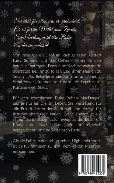 Sie steht für alles, was er verabscheut.Er ist für sie Mittel zum Zweck.Sein Verlangen ist ihre Buße.An der sie zerbricht.Von ihrer großen Liebe im Stich gelassen, klettert Lady Summer auf das Geländer einer Brücke, bereit zu springen. Doch eine Nachtschwärmerin überredet sie, ihr zu folgen und ihren Namen zu ändern. Als Bella lernt sie von nun an Londons Schattenwelt kennen und wird die begehrteste Kurtisane der Stadt.Für den schottischen Duke Rohan MacDougall gibt es nur ein Ziel im Leben. Stellvertretend für alle Prostituierten der Stadt soll eine einzige für ihre Sündhaftigkeit büßen. Keine andere ist aus seiner Sicht besser dafür geeignet als Bella, die Königin der Nacht. Damit sie ihn begleitet, verspricht er ihr eine Reise nach Paris.Als die Fahrt in den schottischen Highlands endet, ist es für Summer zu spät, dem kalten Mann zu entkommen.Weihnachtsausgabe