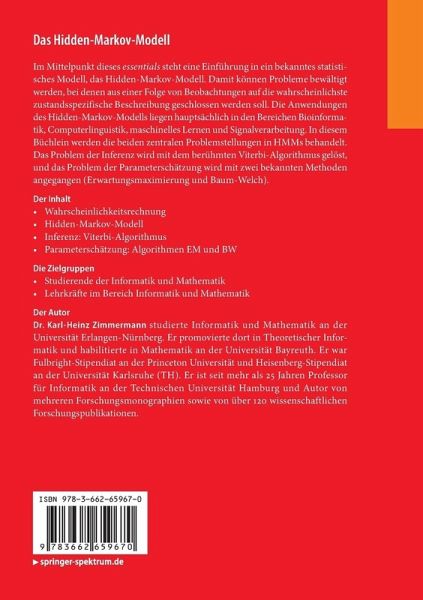 Im Mittelpunkt dieses essentials steht eine Einführung in ein bekanntes statistisches Modell, das Hidden-Markov-Modell.Damit können Probleme bewältigt werden, bei denen aus einer Folge von Beobachtungen auf die wahrscheinlichste zustandsspezifische Beschreibung geschlossen werden soll.Die Anwendungen des Hidden-Markov-Modells liegen hauptsächlich in den Bereichen Bioinformatik, Computerlinguistik, maschinelles Lernen und Signalverarbeitung.In diesem Büchlein werden die beiden zentralen Problemstellungen in HMMs behandelt.Das Problem der Inferenz wird mit dem berühmten Viterbi-Algorithmus gelöst, und das Problem der Parameterschätzung wird mit zwei bekannten Methoden angegangen (Erwartungsmaximierung und Baum-Welch).