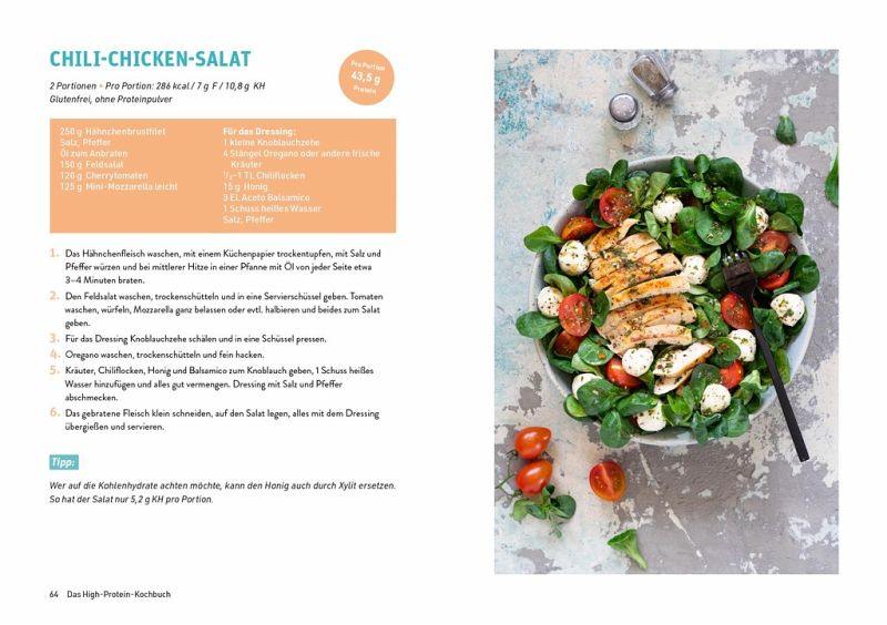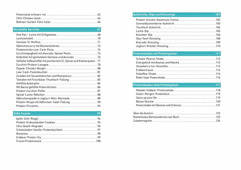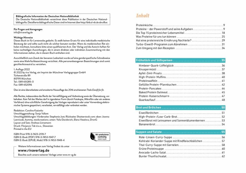 Eine optimale Eiweißversorgung ist wichtig für Sportler und für alle, die abnehmen wollen. Sie unterstützt dich dabei, Muskelmasse aufzubauen, Körperfett zu reduzieren und lange satt zu bleiben. Damit du den ganzen Tag über optimal mit genügend Protein versorgt bist, bietet dir dieses Buch mehr als 60 eiweißreiche Rezeptideen, zum Beispiel Wraps mit Hähnchen-Salat-Füllung, Protein-Piccolinis, einen nährstoffreichen Quarkauflauf, gesunde Brownies und auch eine Vielzahl leckerer Eiweiß-Shakes. Die High-Protein-Mahlzeiten sind schnell zubereitet, weshalb du sie auch ganz einfach in deinen Alltag integrieren kannst.