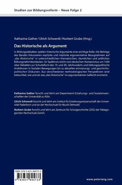 Vorwort der Reihenherausgeber*innen - Katharina Gather, Nobert Grube und Ulrich Schwerdt - Einführende Gedanken zum "Historischen als Argument" - Bildungsreformdebatten und fachliche Diskurse - Julia Kurig - Bildung, Geschichte und Nation. Zur Herausbildung historischer Begründung nationaler Bildungsreform im dt. Humanismus um 1500 - Sabrina Sattler - Historische Legitimationsstrategien der mehrsprachigen Bildungsplanung des Luxemburger Schulwesens seit dem 19. Jahrhundert - Katharina Gather, Nobert Grube und Ulrich Schwerdt - Wie konturiert sich das Historische als Argument? Geschichtsbezüge in westdeutschen Bildungsreformdebatten der 1960er und 70er Jahre - Sebastian Gräber - Zwischen Geisteswissenschaft und Kritischer Theorie. Der Geschichtsbegriff und seine argumentative Funktion bei Herwig Blankertz - Bildungspolitische Ambitionen in sozialen Bewegungen - Elija Horn - Historisierende Indienbezüge in Jugendkulturen des 20. Jahrhunderts - Andrea De Vincenti und Andreas Hoffmann-Ocon - Erinnerungen an die pädagogische Zukunft? Bezugnahmen auf Vergangenes in Debatten um Schule und Kindergarten in der Zürcher Lehrer*innenbildung der 1960er und 70er Jahre - Erinnerungs- und geschichtspolitische Diskurse - Habbo Knoch - "Aufarbeitung der Vergangenheit": Adornos Postulat als ein unvollendetes Projekt - Johannes Richter - Verschickungskinder im Spannungsfeld von Citizen- Science, Reconciliation Policies und Nutzer*innen- Forschung - Einblicke in eine geschichtspolitische Arena - Autor*innenverzeichnis