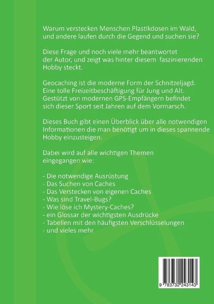 Warum verstecken Menschen Plastikdosen im Wald, und andere laufen durch die Gegend und suchen sie?Diese Frage und noch viele mehr beantwortet der Autor, und zeigt was hinter diesem faszinierenden Hobby steckt.Geocaching ist die moderne Form der Schnitzeljagd. Eine tolle Freizeitbeschäftigung für Jung und Alt.Gestützt von modernen GPS-Empfängern befindet sich dieser Sport seit Jahren auf dem Vormarsch.Dieses Buch gibt einen Überblick über alle notwendigen Informationen die man benötigt um in dieses spannende Hobby einzusteigen.Dabei wird auf alle wichtigen Themen eingegangen wie:- Die notwendige Ausrüstung- Das Suchen von Caches- Das Verstecken von eigenen Caches- Was sind Travel-Bugs?- Wie löse ich Mystery-Caches?- ein Glossar der wichtigsten Ausdrücke- Tabellen mit den häufigsten Verschlüsselungen- und vieles mehr