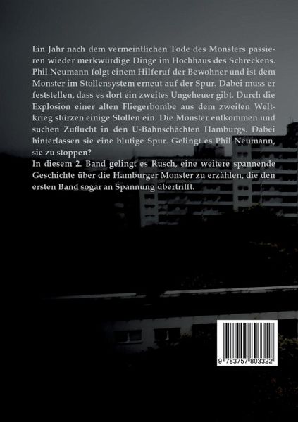 Ein Jahr nach dem vermeintlichen Tode des Monsters passieren wieder merkwürdige Dinge im Hochhaus des Schreckens. Phil Neumann folgt einem Hilferuf der Bewohner und ist dem Monster im Stollensystem erneut auf der Spur. Dabei muss er feststellen, dass es dort ein zweites Ungeheuer gibt. Durch die Explosion einer alten Fliegerbombe aus dem zweiten Weltkrieg stürzen einige Stollen ein. Die Monster entkommen und suchen Zuflucht in den U-Bahnschächten Hamburgs. Dabei hinterlassen sie eine blutige Spur. Gelingt es Phil Neumann, sie zu stoppen? In diesem 2. Band gelingt es Rusch, eine weitere spannende Geschichte über die Hamburger Monster zu erzählen, die sogar den ersten Band an Spannung übertrifft.