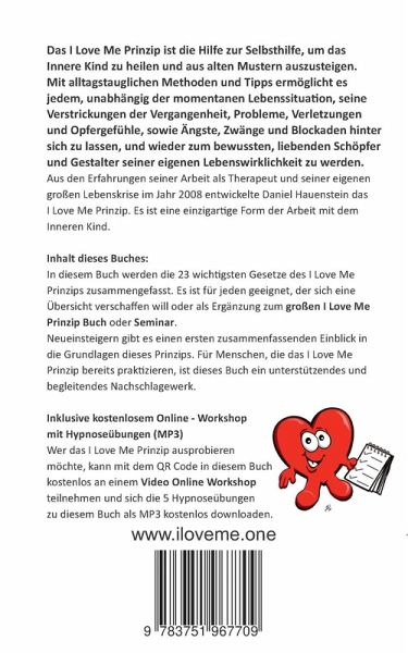 Das I Love Me Prinzip ist die Hilfe zur Selbsthilfe, um das Innere Kind zu heilen und aus alten Mustern auszusteigen. Mit alltagstauglichen Methoden und Tipps ermöglicht es jedem, unabhängig der momentanen Lebenssituation, seine Verstrickungen der Vergangenheit, Probleme, Verletzungen und Opfergefühle, sowie Ängste, Zwänge und Blockaden hinter sich zu lassen, und wieder zum bewussten, liebenden Schöpfer und Gestalter seiner eigenen Lebenswirklichkeit zu werden. Aus den Erfahrungen seiner Arbeit als Therapeut und seiner eigenen großen Lebenskrise im Jahr 2008 entwickelte Daniel Hauenstein das I Love Me Prinzip. Es ist eine einzigartige Form der Arbeit mit dem Inneren Kind. Inhalt dieses Buches: In diesem Buch werden die 23 wichtigsten Gesetze des I Love Me Prinzips zusammengefasst. Es ist für jeden geeignet, der sich eine Übersicht verschaffen will oder als Ergänzung zum großen I Love Me Prinzip Buch oder Seminar. Neueinsteigern gibt es einen ersten zusammenfassenden Einblick indie Grundlagen dieses Prinzips. Für Menschen, die das I Love Me Prinzip bereits praktizieren, ist dieses Buch ein unterstützendes und begleitendes Nachschlagewerk. Inklusive kostenlosem Online - Workshop mit Hypnoseübungen (MP3) Wer das I Love Me Prinzip ausprobieren möchte, kann mit dem QR Code in diesem Buch kostenlos an einem Video Online Workshop teilnehmen und sich die 5 Hypnoseübungen zu diesem Buch als MP3 kostenlos downloaden.