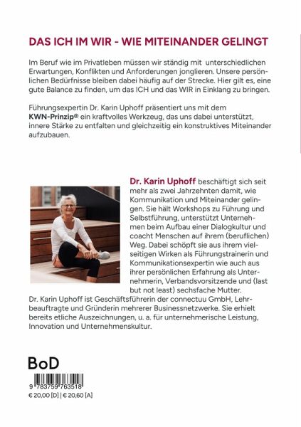 Das ICH im WIR - wie Miteinander gelingt Im Beruf wie im Privatleben müssen wir ständig mit unterschiedlichen Erwartungen, Konflikten und Anforderungen jonglieren. Unsere persönlichen Bedürfnisse bleiben dabei häufig auf der Strecke. Hier gilt es, eine gute Balance zu finden, um das ICH und das WIR in Einklang zu bringen. Führungsexpertin Dr. Karin Uphoff präsentiert uns mit dem KWN-Prinzip® ein kraftvolles Werkzeug, das uns dabei unterstützt, innere Stärke zu entfalten und gleichzeitig ein konstruktives Miteinander aufzubauen.
