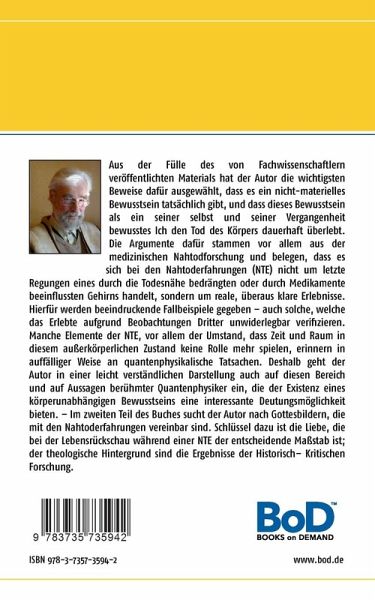 Aus der Fülle des von Fachwissenschaftlern veröffentlichten Materials hat der Autor die wichtigsten Beweise dafür ausgewählt, dass es ein nicht-materielles Bewusstsein tatsächlich gibt, und dass dieses Bewusstsein als ein seiner selbst und seiner Vergangenheit bewusstes Ich den Tod des Körpers dauerhaft überlebt. Die Argumente dafür stammen vor allem aus der medizinischen Nahtodforschung und belegen, dass es sich bei den Nahtoderfahrungen (NTE) nicht um letzte Regungen eines durch die Todesnähe bedrängten oder durch Medikamente beeinflussten Gehirns handelt, sondern um reale, überaus klare Erlebnisse. Hierfür werden beeindruckende Fallbeispiele gegeben - auch solche, welche das Erlebte aufgrund Beobachtungen Dritter unwiderlegbar verifizieren. Manche Elemente der NTE, vor allem der Umstand, dass Zeit und raum in diesem außerkörperlichen Zustand keine Rolle mehr spielen, erinnern in auffälliger Weise an quantenphysikalischen Tatsachen. Deshalb geht der Autor in einer leicht verständlichen Darstellung auch auf diesen Bereich und auf Aussagen berühmter Quantenphysiker ein, die der Existenz eines körperunabhängigen Bewusstseins eine interessante Deutungsmöglichkeit bieten. - In einem zweiten Teil des Buches sucht der Autor nach Gottesbildern, die mit den Nahtoderfahrungen vereinbar sind. Schlüssel dazu ist die Liebe, die bei der Lebensrückschau während einer NTE der entscheidende Maßstab ist; der theologische Hintergrund sind die Ergebnisse der Historisch- Kritischen Forschung.