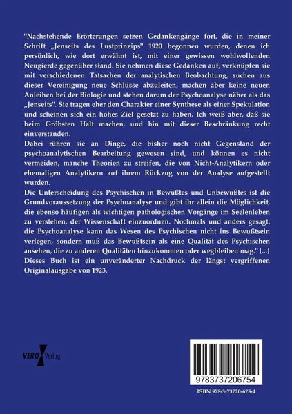 "Nachstehende Erörterungen setzen Gedankengänge fort, die in meiner Schrift Jenseits des Lustprinzips" 1920 begonnen wurden, denen ich persönlich, wie dort erwähnt ist, mit einer gewissen wohlwollenden Neugierde gegenüber stand. Sie nehmen diese Gedanken auf, verknüpfen sie mit verschiedenen Tatsachen der analytischen Beobachtung, suchen aus dieser Vereinigung neue Schlüsse abzuleiten, machen aber keine neuen Anleihen bei der Biologie und stehen darum der Psychoanalyse näher als das Jenseits". Sie tragen eher den Charakter einer Synthese als einer Spekulation und scheinen sich ein hohes Ziel gesetzt zu haben. Ich weiß aber, daß sie beim Gröbsten Halt machen, und bin mit dieser Beschränkung recht einverstanden.
