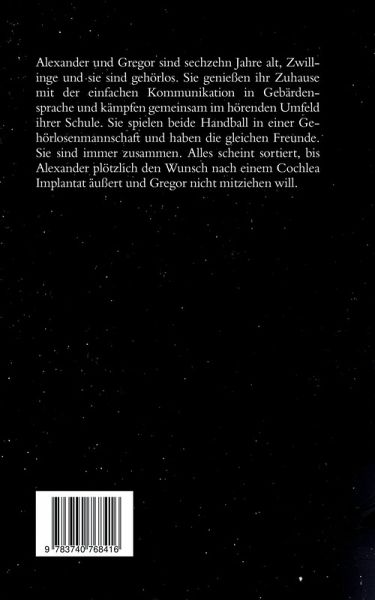 Alexander und Gregor sind sechzehn Jahre alt, Zwillinge und sie sind gehörlos. Sie genießen ihr Zuhause mit der einfachen Kommunikation in Gebärdensprache und kämpfen gemeinsam im hörenden Umfeld ihrer Schule. Sie spielen beide Handball in einer Gehörlosenmannschaft und haben die gleichen Freunde. Sie sind immer zusammen. Alles scheint sortiert, bis Alexander plötzlich den Wunsch nach einem Cochlea Implantat äußert und Gregor nicht mitziehen will.