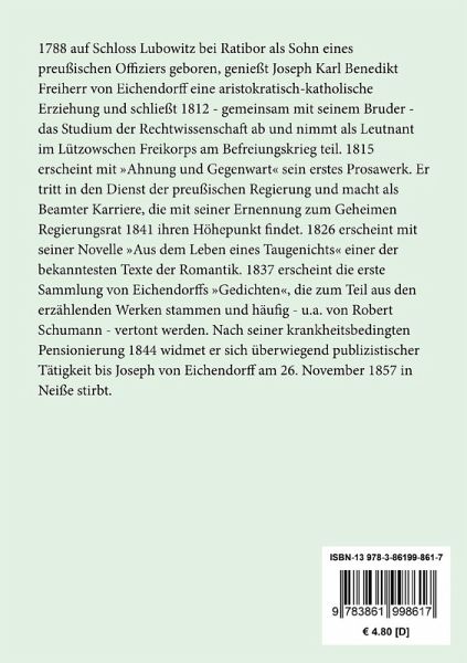1788 auf Schloss Lubowitz bei Ratibor als Sohn eines preußischen Offiziers geboren, genießt Joseph Karl Benedikt Freiherr von Eichendorff eine aristokratisch-katholische Erziehung und schließt 1812 - gemeinsam mit seinem Bruder - das Studium der Rechtwissenschaft ab und nimmt als Leutnant im Lützowschen Freikorps am Befreiungskrieg teil. 1815 erscheint mit "Ahnung und Gegenwart" sein erstes Prosawerk. Er tritt in den Dienst der preußischen Regierung und macht als Beamter Karriere, die mit seiner Ernennung zum Geheimen Regierungsrat 1841 ihren Höhepunkt findet. 1826 erscheint mit seiner Novelle "Aus dem Leben eines Taugenichts" einer der bekanntesten Texte der Romantik. 1837 erscheint die erste Sammlung von Eichendorffs "Gedichten", die zum Teil aus den erzählenden Werken stammen und häufig - u.a. von Robert Schumann - vertont werden. Nach seiner krankheitsbedingten Pensionierung 1844 widmet er sich überwiegend publizistischer Tätigkeit bis Joseph von Eichendorff am 26. November 1857 in Neiße stirbt.
