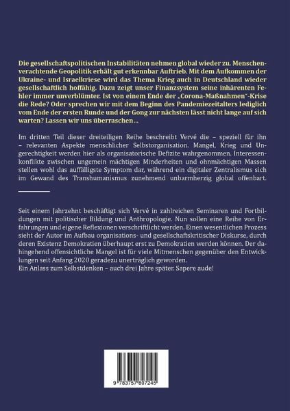 Die gesellschaftspolitischen Instabilitäten nehmen global wieder zu. Menschenverachtende Geopolitik erhält gut erkennbar Auftrieb. Mit dem Aufkommen der Ukraine- und Israelkriese wird das Thema Krieg auch in Deutschland wieder gesellschaftlich hoffähig. Dazu zeigt unser Finanzsystem seine inhärenten Fehler immer unverblümter. Ist von einem Ende der "Corona-Maßnahmen"-Krise die Rede? Oder sprechen wir mit dem Beginn des Pandemiezeitalters lediglich vom Ende der ersten Runde und der Gong zur nächsten lässt nicht lange auf sich warten? Lassen wir uns überraschen...Im dritten Teil dieser dreiteiligen Reihe beschreibt Vervé die - speziell für ihn - relevanten Aspekte menschlicher Selbstorganisation. Mangel, Krieg und Ungerechtigkeit werden hier als organisatorische Defizite wahrgenommen. Interessenkonflikte zwischen ungemein mächtigen Minderheiten und ohnmächtigen Massen stellen wohl das auffälligste Symptom dar, während ein digitaler Zentralismus sich im Gewand des Transhumanismus zunehmend unbarmherzig global offenbart.