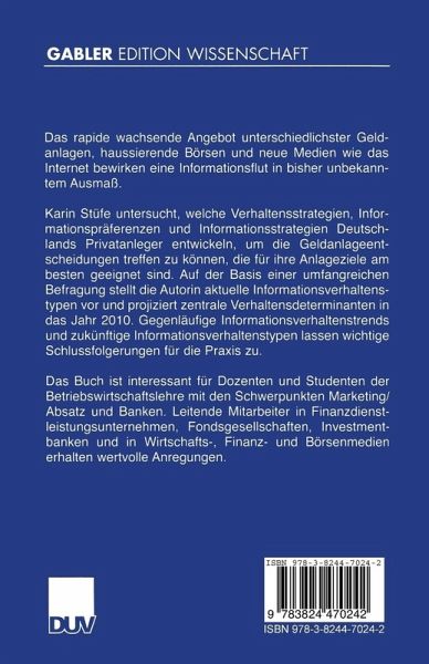 Das rapide wachsende Angebot unterschiedlichster Geldanlagen, haussierende Börsen und neue Medien wie das Internet bewirken eine Informationsflut in bisher unbekanntem Ausmaß. Karin Stüfe untersucht, welche Verhaltensstrategien, Informationspräferenzen und Informationsstrategien Deutschlands Privatanleger entwickeln, um die Geldanlageentscheidungen treffen zu können, die für ihre Anlageziele am besten geeignet sind. Auf der Basis einer umfangreichen Befragung stellt die Autorin aktuelle Informationsverhaltenstypen vor und projiziert zentrale Verhaltensdeterminanten in das Jahr 2010. Gegenläufige Informationsverhaltenstrends und zukünftige Informationsverhaltenstypen lassen wichtige Schlussfolgerungen für die Praxis zu.