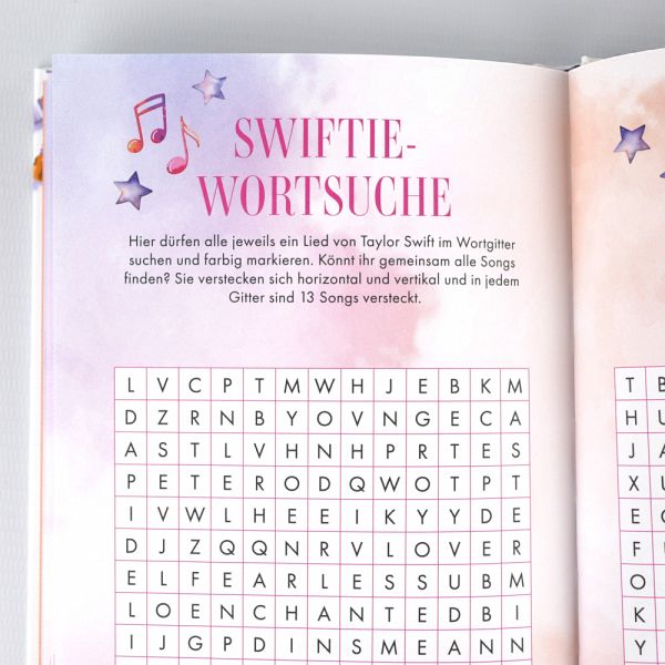 In ihrem Song »You're on your own, Kid« besingt Taylor Swift das Knüpfen von Freundschaftsarmbändern und ruft so einen neuen Hype um das kreative Hobby hervor. Mit diesem Freundebuch können Swifties diesen Trend auf ein ganz neues Level bringen: Sie können Freundschaftsarmbänder ausmalen, Seiten über sich selbst und den oder die andere_n ausfüllen und gemeinsam rätseln. Außerdem können Swifties sich natürlich zu ihrer Lieblingssängerin austauschen und so ihre Freundschaft vertiefen.