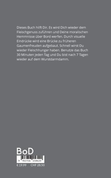 Dieses Buch hilft Dir. Es wird Dich wieder dem Fleischgenuss zuführen und Deine moralischen Hemmnisse über Bord werfen. Durch visuelle Eindrücke wird eine Brücke zu früheren Gaumenfreuden aufgebaut. Schnell wirst Du wieder Fleischhunger haben. Benutze das Buch 30 Minuten jeden Tag und Du bist nach 7 Tagen wieder auf dem Wurstdarmdamm.