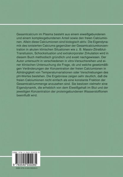 Gesamtkalzium im Plasma besteht aus einem eiweißgebundenen und einem komplexgebundenen Anteil sowie den freien Kalziumionen. Allein diese Kalziumionen sind biologisch aktiv. Die Eigendynamik des ionisierten Kalziums gegenüber der Gesamtkalziumkonzentration in akuten klinischen Situationen wie z. B. Massiv-Zitratblut-Transfusion, Schocksituation und extrakorporaler Zirkulation wird in diesem Buch methodisch gründlich und exakt nachgewiesen. Der Autor untersucht in verschiedenen in vitro-Versuchsreihen und einer klinischen Untersuchung die Frage, ob und welche gesetzmäßigen Veränderungen der Konzentration der freien Kalziumionen in Abhängigkeit von Temperaturvariationen oder Verschiebungen des pH-Wertes bestehen. Die Ergebnisse zeigen sehr deutlich, daß die freien Kalziumionen nicht einfach als eine konstante Fraktion der Gesamtkalziummenge anzusehen sind. Sie besitzen vielmehr eine Eigendynamik, die erheblich von dem Eiweißgehalt im Blut und der jeweiligen Konzentration der proteingebundenen Wasserstoffionen beeinflußt wird.