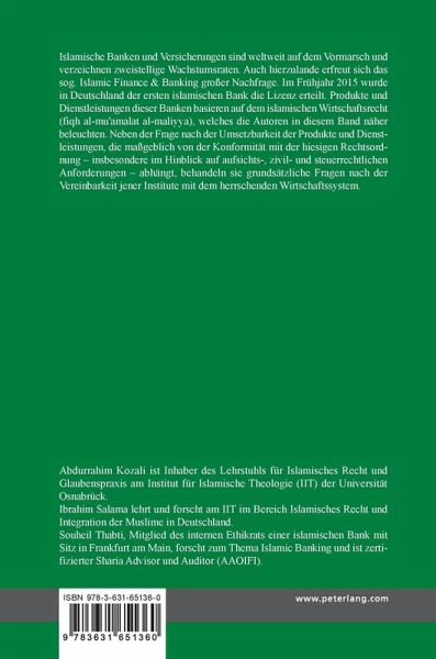 Abdurrahim Kozali ist Inhaber des Lehrstuhls für Islamisches Recht und Glaubenspraxis am Institut für Islamische Theologie (IIT) der Universität Osnabrück. Ibrahim Salama lehrt und forscht am IIT im Bereich Islamisches Recht und Integration der Muslime in Deutschland. Souheil Thabti, Mitglied des internen Ethikrats einer islamischen Bank mit Sitz in Frankfurt am Main, forscht zum Thema Islamic Banking und ist zertifizierter Sharia Advisor und Auditor (AAOIFI).
