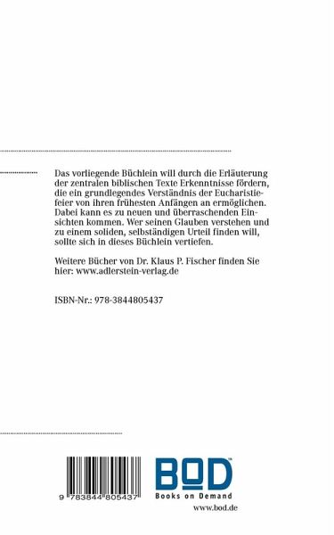 Das vorliegende Büchlein will durch die Erläuterung der zentralen biblischen Texte Erkenntnisse fördern, die ein grundlegendes Verständnis der Eucharistiefeier von ihren frühesten Anfängen an ermöglichen. Dabei kann es zu neuen und überraschenden Einsichten kommen. Wer seinen Glauben verstehen und zu einem soliden, selbständigen Urteil finden will, sollte sich in dieses Büchlein vertiefen.Herausgeber: Hans-Jürgen Sträter, Adlerstein Verlag