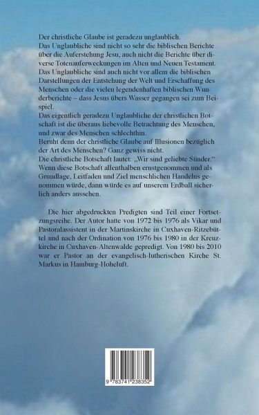 Der christliche Glaube ist geradezu unglaublich. Das Unglaubliche sind nicht so sehr die biblischen Berichte über die Auferstehung Jesu, auch nicht die Berichte über diverse Totenauferweckungen im Alten und Neuen Testament. Das Unglaubliche sind auch nicht vor allem die biblischen Darstellungen der Entstehung der Welt und Erschaffung des Menschen oder die vielen legendenhaften biblischen Wunderberichte - dass Jesus übers Wasser gegangen sei zum Beispiel.Das eigentlich geradezu Unglaubliche der christlichen Botschaft ist die überaus liebevolle Betrachtung des Menschen, und zwar des Menschen schlechthin. Beruht denn der christliche Glaube auf Illusionen bezüglich der Art des Menschen? Ganz gewiss nicht. Die christliche Botschaft lautet: "Wir sind geliebte Sünder." Wenn diese Botschaft allenthalben ernstgenommen und als Grundlage, Leitfaden und Ziel menschlichen Handelns genommen würde, dann würde es auf unserem Erdball sicherlich anders aussehen.