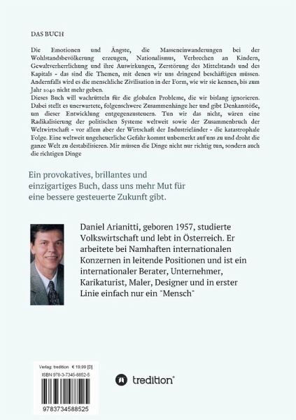 Die Emotionen und Ängste, die Masseneinwanderungen bei der Wohlstandsbevölkerung erzeugen, Nationalismus, Verbrechen an Kindern, Gewaltverherrlichung und ihre Auswirkungen, Zerstörung des Mittelstands und des Kapitals - das sind die Themen, mit denen wir uns dringend beschäftigen müssen. Andernfalls wird es die menschliche Zivilisation in der Form, wie wir sie kennen, bis zum Jahr 2040 nicht mehr geben. Dieses Buch will wachrütteln für die globalen Probleme, die wir bislang ignorieren. Dabei stellt es unerwartete, folgenschwere Zusammenhänge her und gibt Denkanstöße, um dieser Entwicklung entgegenzusteuern. Tun wir das nicht, wären eine Radikalisierung der politischen Systeme weltweit sowie der Zusammenbruch der Weltwirtschaft - vor allem aber der Wirtschaft der Industrieländer - die katastrophale Folge.