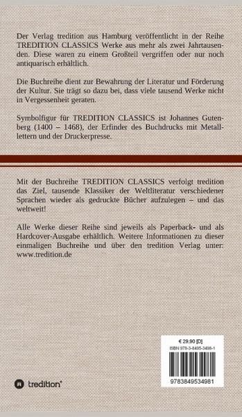 Diese Hardcover-Ausgabe ist Teil der TREDITION CLASSICS. Der Verlag tredition aus Hamburg veröffentlicht in der Buchreihe TREDITION CLASSICS Werke aus mehr als zwei Jahrtausenden. Diese waren zu einem Großteil vergriffen oder nur noch antiquarisch erhältlich. Mit TREDITION CLASSICS verfolgt tredition das Ziel, tausende Klassiker der Weltliteratur verschiedener Sprachen wieder als gedruckte Bücher zu verlegen und das weltweit! Die Buchreihe dient zur Bewahrung der Literatur und Förderung der Kultur. Sie trägt so dazu bei, dass viele tausend Werke nicht in Vergessenheit geraten.