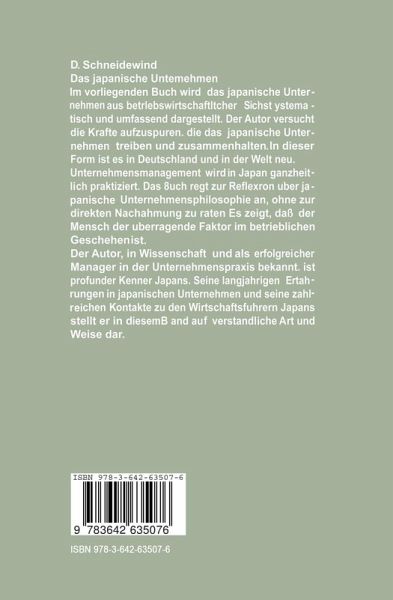 Im vorliegenden Buch wird das japanische Unternehmen aus betriebswirtschaftlicher Sicht systematisch und umfassend dargestellt. Der Autor versucht, die Kräfte aufzuspüren, die das japanische Unternehmen treiben und zusammenhalten. In dieser Form ist es in Deutschland und in der Welt absolut neu. Unternehmensmanagement wird in Japan ganzheitlich praktiziert. Das Buch regt zur Reflexion über japanische Unternehmensphilosophie an, ohne zur direkten Nachahmung zu raten. Es zeigt, daß der Mensch der überragende Faktor im betrieblichen Geschehen ist. Der Autor, in Wissenschaft und als erfolgreicher Manager in der Unternehmenspraxis bekannt, ist profunder Kenner Japans. Seine langjährigen Erfahrungen in japanischen Unternehmen und seine zahlreichen Kontakte zu den Wirtschaftsführern Japans stellt er in diesem Band auf verständliche Art und Weise dar.