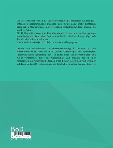 Der Titel "Das Buch Jesaja 1-12 - Die Jesus-Chronologie" ergibt sich aus dem neu entdeckten Zusammenhang zwischen dem heute nicht mehr sichtbaren hebräischen Absatzsystem, eine verschollen geglaubte Jubiläen-Chronologie und Jesu Geburt! Die 42 Abschnitte werden als Kalender von den Urvätern bis zu Jesus gelesen und erhellen die historischen Bezüge über die Zeit. Das Buch ist in diese 42 Abschnitte eingeteilt und eine Vorschau zu Jesaja 13-27 bis in unsere Gegenwart ermittelt worden.