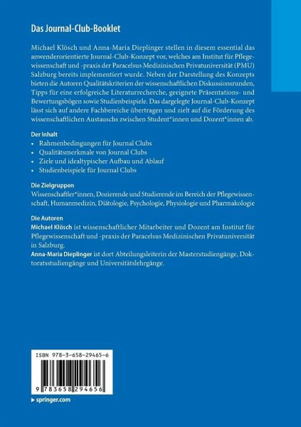Michael Klösch und Anna-Maria Dieplinger stellen in diesem essential das anwenderorientierte Journal-Club-Konzept vor, welches am Institut für Pflegewissenschaft und -praxis der Paracelsus Medizinischen Privatuniversität (PMU) Salzburg bereits implementiert wurde. Neben der Darstellung des Konzepts bieten die Autoren Qualitätskriterien der wissenschaftlichen Diskussionsrunden, Tipps für eine erfolgreiche Literaturrecherche, geeignete Präsentations- und Bewertungsbögen sowie Studienbeispiele. Das dargelegte Journal-Club-Konzept lässt sich auf andere Fachbereiche übertragen und zielt auf die Förderung des wissenschaftlichen Austauschs zwischen Student_innen und Dozent_innen ab.