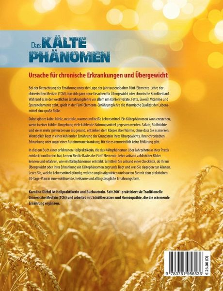 Entdecken Sie die heilende Kraft der Fünf-Elemente-Ernährungslehre und überwinden Sie Übergewicht und chronische Krankheiten!Die Chinesische Medizin (TCM) hat eine ganz eigene Sicht auf die Ernährung. Während es in der westlichen Ernährungslehre vor allem um Kohlenhydrate, Fette, Eiweiß, Vitamine und Spurenelemente geht, spielt in der Fünf-Elemente-Ernährungslehre der TCM die thermische Qualität der Lebensmittel eine entscheidende Rolle. Man unterscheidet kalte, kühle, neutrale, warme und heiße Nahrungsmittel. Ein Kältephänomen kann entstehen, wenn viele kühlende Lebensmittel in einer kühlen Umgebung gegessen werden. Salate, Rohkost und vieles mehr gelten bei uns als gesund, entziehen dem Körper aber unbemerkt Wärme. Möglicherweise liegt in einer kühlenden Ernährung die Ursache für Ihr Übergewicht, Ihre chronische Erkrankung oder gar eine Autoimmunerkrankung, für die es scheinbar keine Erklärung gibt. In diesem Buch einer erfahrenen Heilpraktikerin, die das Kältephänomen jahrzehntelang in ihrer Praxis diagnostiziert und behandelt hat, lernen Sie anhand zahlreicher Bilder die Grundlagen der Fünf-Elemente-Lehre kennen und erfahren, wie ein Kältephänomen entsteht. Finden Sie anhand einer Checkliste heraus, ob Ihr Übergewicht oder Ihre Krankheit ein Kältephänomen verursacht und was Sie dagegen tun können. Lesen Sie, welche Lebensmittel günstig und welche ungünstig wirken und starten Sie mit dem praktischen 30-Tage-Plan in eine wohltuende, heilsame und alltagstaugliche Ernährungsform.