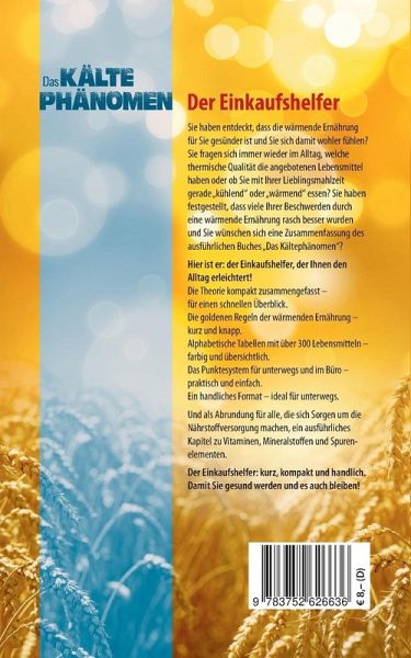 Sie haben entdeckt, dass die wärmende Ernährung für Sie gesünder ist und Sie sich damit wohler fühlen? Sie fragen sich immer wieder im Alltag, welche thermische Qualität die angebotenen Lebensmittel haben oder ob Sie mit Ihrer Lieblingsmahlzeit gerade "kühlend" oder "wärmend" essen? Sie haben festgestellt, dass viele Ihrer Beschwerden durch eine wärmende Ernährung rasch besser wurden und Sie wünschen sich eine Zusammenfassung des ausführlichen Buches "Das Kältephänomen"?Der Einkaufshelfer enthält die wichtigsten Informationen aus "Das Kältephänomen" und beinhaltet darüber hinaus eine farbige…mehr
