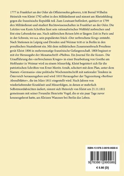 1777 in Frankfurt an der Oder als Offizierssohn geboren, tritt Bernd Wilhelm Heinrich von Kleist 1792 selbst in den Militärdienst und nimmt am Rheinfeldzug gegen die französische Republik teil. Zum Leutnant befördert, quittiert er 1799 den Militärdienst und studiert Rechtswissenschaften in Frankfurt an der Oder. Die Lektüre von Kants Schriften lässt sein rationalistisches Weltbild zerbrechen und löst eine Lebenskrise aus. Nach zahlreichen Reisen lebt er längere Zeit in Paris und in der Schweiz, wo u.a. sein populärstes Stück "Der zerbrochene Krug" entsteht. Nach Stationen in Leipzig und Dresden und Weimar tritt er in Berlin in den preußischen Staatsdienst ein. Mit dem militärischen Zusammenbruch Preußens gerät Kleist 1806 in mehrmonatige französische Gefangenschaft. 1808 beginnt er mit der Herausgabe der Monatsschrift "Phöbus. Ein Journal für die Kunst". Die Uraufführung des "zerbrochenen Kruges" in einer Bearbeitung von Goethe am Hoftheater in Weimar wird zu einem Misserfolg. Kleist begeistert sich für die patriotischen Schriften von Ernst Moritz Arndt, scheitert mit dem Plan, unter dem Namen "Germania" eine politische Wochenzeitschrift mit nationaler Tendenz in Österreich herauszugeben und wird 1810 Herausgeber der Tageszeitung "Berliner Abendblätter", die im März 1811 eingestellt wird. Nach Jahren von wiederkehrender Krankheit und Misserfolgen, in denen er mehrfach Selbstmordabsichten äußert, nimmt sich Heinrich von Kleist am 21.11.1811 gemeinsam mit seiner Freundin Henriette Vogel, die er ein paar Tage zuvor kennengelernt hatte, am Kleinen Wannsee bei Berlin das Leben.
