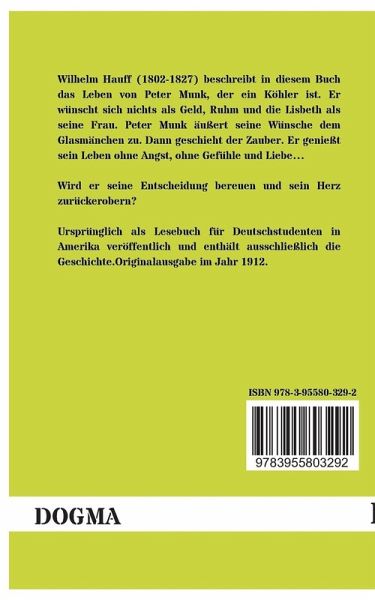 Wilhelm Hauff (1802-1827) beschreibt in diesem Buch das Leben von Peter Munk, der ein Köhler ist. Er wünscht sich nichts als Geld, Ruhm und die Lisbeth als seine Frau. Peter Munk äußert seine Wünsche dem Glasmänchen zu. Dann geschieht der Zauber. Er genießt sein Leben ohne Angst, ohne Gefühle und Liebe