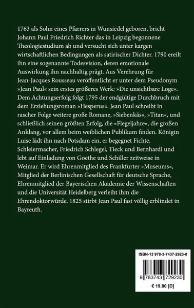 1763 als Sohn eines Pfarrers in Wunsiedel geboren, bricht Johann Paul Friedrich Richter das in Leipzig begonnene Theologiestudium ab und versucht sich unter kargen wirtschaftlichen Bedingungen als satirischer Dichter. 1790 ereilt ihn eine sogenannte Todesvision, deren emotionale Auswirkung ihn nachhaltig prägt. Aus Verehrung für Jean-Jacques Rousseau veröffentlicht er unter dem Pseudonym "Jean Paul" sein erstes größeres Werk: "Die unsichtbare Loge". Dem Achtungserfolg folgt 1795 der endgültige Durchbruch mit dem Erziehungsroman "Hesperus". Jean Paul schreibt in rascher Folge weitere große Romane, "Siebenkäs", "Titan", und schließlich seinen größten Erfolg, die "Flegeljahre", die großen Anklang, vor allem beim weiblichen Publikum finden. Königin Luise lädt ihn nach Potsdam ein, er begegnet Fichte, Schleiermacher, Friedrich Schlegel, Tieck und Bernhardi und lebt auf Einladung von Goethe und Schiller zeitweise in Weimar. Er wird Ehrenmitglied des Frankfurter "Museums", Mitglied der Berlinischen Gesellschaft für deutsche Sprache, Ehrenmitglied der Bayerischen Akademie der Wissenschaften und die Universität Heidelberg verleiht ihm die Ehrendoktorwürde. 1825 stirbt Jean Paul fast völlig erblindet in Bayreuth.