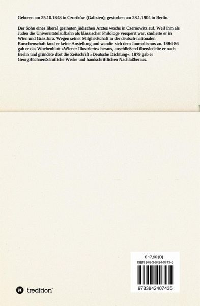 Geboren am 25.10.1848 in Czortków (Galizien); gestorben am 28.1.1904 in Berlin. Der Sohn eines liberal gesinnten jüdischen Arztes wuchs in Czernowitz auf. Weil ihm als Juden die Universitätslaufbahn als klassischer Philologe versperrt war, studierte er in Wien und Graz Jura. Wegen seiner Mitgliedschaft in der deutsch-nationalen Burschenschaft fand er keine Anstellung und wandte sich dem Journalismus zu. 1884-86 gab er das Wochenblatt »Wiener Illustrierte« heraus, anschließend übersiedelte er nach Berlin und gründete dort die Zeitschrift »Deutsche Dichtung«. 1879 gab er Georg Büchners Sämtliche Werke und handschriftlichen Nachlaß heraus.