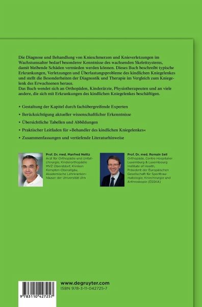 Dieses Buch beschreibt typische Verletzungen, Überlastungsprobleme und Erkrankungen des kindlichen Kniegelenks. Da eine Schädigung der kniegelenknahen Wachstumsfugen zu schweren Fehlstellungen des Gelenkes führen kann, ergeben sich für die Diagnose und Behandlung von Knieschmerzen und Knieverletzungen im Wachstumsalter besondere Differentialdiagnosen und Therapieprinzipien. Diese werden in diesem Buch im Vergleich zum Kniegelenk des Erwachsenen ausführlich beschrieben. Das Buch richtet sich an alle Ärzte und Therapeuten, die Kinder und Jugendliche behandeln.