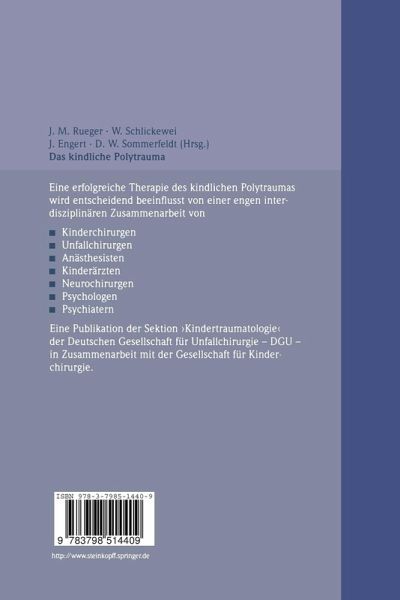 1 Verletzungsmuster und Organversagen beim kindlichen Polytrauma.- 2 Phasengerechte Versorgung des kindlichen Polytraumas.- 3 Frühoperationen der ersten 24 Stunden.- 4 Intensivmanagement des polytraumatisierten Kindes.- 5 Definitive Frakturversorgung und Rehabilitationsmaßnahmen des polytraumatisierten Kindes.- 6 Das kindliche Schädel-Hirn-Trauma - Standards und Besonderheiten.- 7 Das Thoraxtrauma im Kindesalter.- 8 Beckenverletzungen beim Kind - Besondere Aspekte beim Polytrauma.- 9 Wirbelsäulenverletzungen beim kindlichen Polytrauma.- 10 Extremitätenversorgung beim kindlichen Polytrauma.- 11 Kindliche Handverletzungen.- 12 Tipps für den Kinderschockraum.- 13 Kinderpsychiatrische Aspekte des kindlichen Polytraumas.