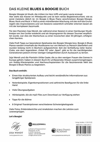 Boogie-Woogie ist Musik, die mitten ins Herz trifft und gute Laune pur erzeugt. Hier steht das Klavier im Mittelpunkt und ist kein reines Begleitinstrument, wie es sonst meistens üblich ist. Im Boogie & Blues Piano verschmelzen Boogie-Woogie, Blues, Rock und Rock 'n' Roll zu einer mitreißenden Mischung, mit der sich die Grundregeln des Improvisierens und von Sessions wesentlich schneller erlernen lassen als mit der komplexen Jazzmusik.Für den Pianisten Joja Wendt, der während einer Session in einer Hamburger Musikkneipe von Joe Cocker entdeckt und als Vorprogramm für dessen Tournee verpflichtet wurde, war diese Musik der Einstieg zu seiner inzwischen über 30-jährigen, erfolgreichen Karriere. Viele Profi-Tipps zur besonderen Spielweise des Boogie-Woogie bzw. Boogie & Blues Pianos werden innerhalb der Musikszene nur von Mensch zu Mensch überliefert und wurden bislang nicht in Büchern aufgezeichnet. Joja Wendt und Ulrike Gaate, die in Europa zu den wenigen Pianistinnen im männerdominierten Genre gehört, haben in diesem Buch ihr Wissen zusammengetragen, um Hobby-Klavierspieler und Nachwuchspianisten für die faszinierende Welt des Boogie & Blues Pianos zu begeistern und ihnen einen Einstieg zu ermöglichen.Das Buch enthält einen klar strukturierten Aufbau, leicht verständliche Informationen aus langjähriger Spielpraxis, Tipps für die Bühne, Eigenkompositionen und viele Übungsaufgaben. Über 40 Hörbeispiele stehen als mp3-Files zum Download in Joja Wendts Online-Klavierschule unter www.jojaspianoacademy.de zur Verfügung. Acht Original-Transkriptionen verschiedener Schwierigkeitsgrade, Klassiker von Hersal Thomas, Albert Ammons, Meade "Lux" Lewis und Jimmy Yancey, runden das Werk ab. Viele Fotos, Erlebnisberichte und Anekdoten machen die Lektüre zum Lesevergnügen.Das Buch ist sowohl für fortgeschrittene Klavierspieler als auch für Anfänger geeignet, die mit dem elementaren Basiswissen des Klavierspiels vertraut sind.