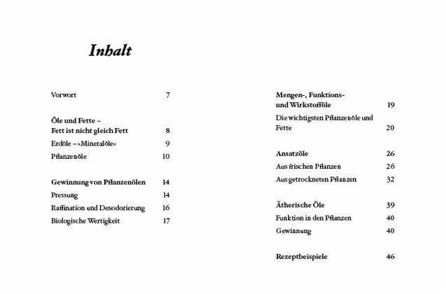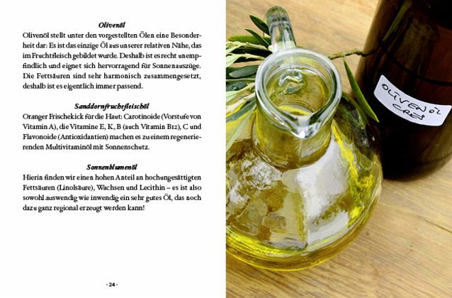 Gestartet wird mit Informationen rund um Öle und Fette, deren Gewinnung, der Unterscheidung von Mengen-, Funktions- und Wirkstoffölen, Ansatzöle und Ätherische Öle. Die Rezeptbeispiele nehmen nur wenig Raum ein, doch das ist völlig in Ordnung, da man selbst sehr schön experimentieren kann. Wichtig ist das Wissen, das dabei hilft, die einzelnen Komponenten sinnvoll und wirkungsvoll richtig zusammenzustellen.