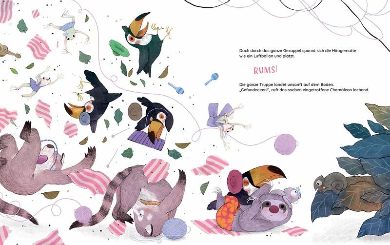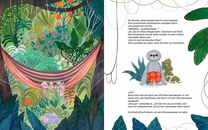 Nach einem heißen Tag im Dschungel möchte das kleine Faultier Rudi einfach nur in seiner Hängematte entspannen. Aber als es dort ankommt, ist die Hängematte schon von den anderen Tieren besetzt. Sie spielen und tanzen und hüpfen - bis irgendwann die Hängematte reißt! Das tut den anderen Tieren sehr leid und schnell ist die Hängematte repariert. Doch Rudi will lieber seine Ruhe. Darauf hat das hungrige Krokodil nur gewartet und schnappt sich die Hängematte samt Faultier. Zum Glück sind die Freunde nicht weit und retten Rudi. Am Ende ist das kleine Faultier sich sicher: eigentlich ist in der Hängematte genug Platz für alle.