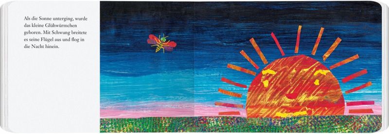 Als die Sonne untergeht, wird das kleine Glühwürmchen geboren. Mit Schwung breitet es seine Flügel aus und fliegt in die Nacht hinein. Es fühlt sich allein, leuchtet umher und sucht nach Artgenossen. Aber das ist gar nicht so leicht, denn nicht alles, was im Dunkeln leuchtet, ist ein Glühwürmchen. Und so wird es von Lampen, Katzenaugen und einem Feuerwerk in die Irre geführt, bis es zu guter Letzt doch noch einen Schwarm Glühwürmchen findet. Auf der letzten Seite leuchten die Glühwürmchen mittels einer Hologrammfolie wie lebendige Glühwürmchen in warmen Sommernächten.