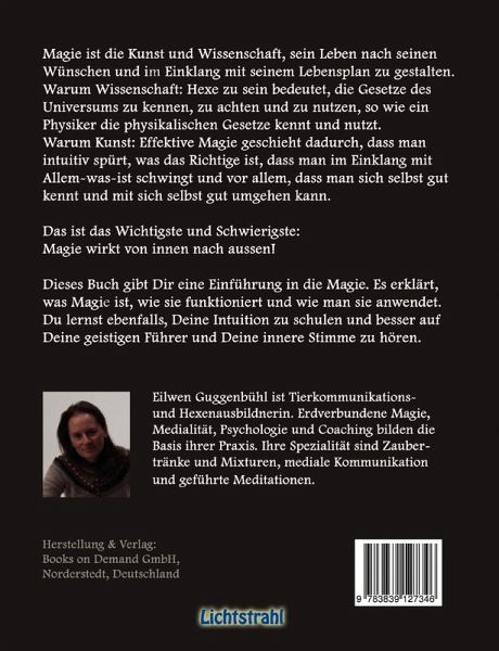 Magie ist die Kunst und Wissenschaft, sein Leben nach seinen Wünschen und im Einklang mit seinem Lebensplan zu gestalten. Warum Wissenschaft: Hexe zu sein bedeutet, die Gesetze des Universums zu kennen, zu achten und zu nutzen, so wie ein Physiker die physikalischen Gesetze kennt und nutzt. Warum Kunst: Effektive Magie geschieht dadurch, dass man intuitiv spürt, was das Richtige ist, dass man im Einklang mit Allem-was-ist schwingt und vor allem, dass man sich selbst gut kennt und mit sich selbst gut umgehen kann. Das ist das Wichtigste und Schwierigste: Magie wirkt von innen nach aussen! Dieses Buch gibt Dir eine Einführung in die Magie. Es erklärt, was Magie ist, wie sie funktioniert und wie man sie anwendet. Du lernst ebenfalls, Deine Intuition zu schulen und besser auf Deine geistigen Führer und Deine innere Stimme zu hören.