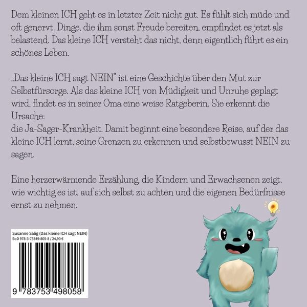 "Das kleine ICH sagt NEIN" ist eine berührende und lehrreiche Geschichte über einen wichtigen Meilenstein in der Entwicklung jedes Menschen - das Erlernen gesunder Grenzen. Mit viel Feingefühl und Weisheit erzählt das Buch von dem kleinen ICH, das unter der "Ja-Sager-Krankheit" leidet und mit Hilfe seiner liebevollen Oma lernt, auch mal "Nein" zu sagen. Die Geschichte begleitet das kleine ICH auf seiner Reise der Selbstentdeckung. Erschöpft von ständigen Verpflichtungen und dem Wunsch, es allen recht zu machen, findet es in seiner Oma eine weise Mentorin. Sie zeigt ihm behutsam, wie wichtig es ist, die eigenen Bedürfnisse wahrzunehmen und Grenzen zu setzen. Mit warmherzigem Humor und einfühlsamen Dialogen vermittelt das Buch zentrale Lebenslektionen: Wie erkenne ich meine persönlichen Werte? Wann ist es in Ordnung "Nein" zu sagen? Und wie kann ich lernen, zu mir selbst "Ja" zu sagen? Schritt für Schritt lernt das kleine ICH, dass wahre Freundschaft nicht davon abhängt, immer "Ja" zu sagen, und dass Selbstfürsorge keine Selbstsucht ist. Diese Geschichte ist ein wertvoller Begleiter für Kinder und Erwachsene gleichermaßen. Sie ermutigt dazu, die eigenen Gefühle ernst zu nehmen und selbstbewusst Grenzen zu setzen. Die liebevollen Illustrationen unterstreichen die positive Botschaft und machen das Buch zu einem besonderen Leseerlebnis. Ein unverzichtbares Buch für alle, die lernen möchten, besser auf sich selbst zu achten und ein ausgewogenes Leben zu führen. Die Geschichte des kleinen ICHs zeigt: Manchmal ist ein liebevolles "Nein" der erste Schritt zu mehr Lebensfreude und authentischen Beziehungen. Diese Geschichte ist mehr als ein Kinderbuch - sie ist eine Einladung zur Selbstentdeckung und ein Wegweiser zu einem Leben im Einklang mit den eigenen Werten und Bedürfnissen.