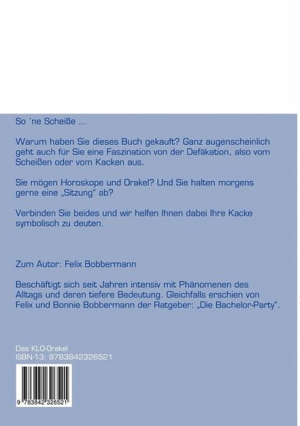 Das KLO-Orakel vermittelt auf spielerische Weise Lust an der Betrachtung der eigenen Fäkalie. Die Form und das Aussehen der eigenen Scheisse wird anhand der beigefügten Graphiken entschlüsselt. So kann das KLO-Orakel unerwartet und überraschend Auskunft darüber geben, wie sich die nahe oder ferne Zukunft entwickeln könnte. Wer mit Lust auf dem Klo sitzt, wird auch dieses Wahrsagespiel lustig finden!