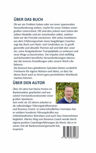 Ob wir ein Problem haben oder vor einer spannenden Herausforderung stehen, macht für unser Erleben einen großen Unterschied. Oft sind dies jedoch zwei Seiten der selben Medaille und wir entscheiden selbst, welcher Seite wir die Priorität einräumen. Mit vielen Anekdoten aus dem Erfahrungsschatz eines langjährigen Coaches regt das Buch zum Nach- und Umdenken an. Es greift generelle und aktuelle Themen auf und lädt den Leser ein, seine festgelaufenen Trampelpfade zu verlassen und neue Wege zu beschreiten. Die Impulse sind vielfältig und behandeln berufliche Herausforderungen ebenso wie die inneren Einstellungen oder unsere Work-Life-Balance. Die bewusst kurz gehaltenen Episoden bieten zusätzlich Freiräume für eigene Notizen und Ideen, so dass Sie dieses Buch auch zu Ihrem ganz persönlichen Workbook machen können.