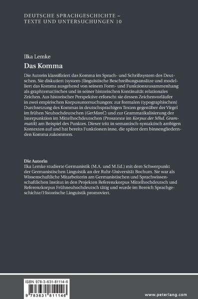 Die Autorin klassifiziert das Komma im Sprach- und Schriftsystem des Deutschen. Sie diskutiert (system-)linguistische Beschreibungsansätze und modelliert das Komma ausgehend von seinem Form- und Funktionszusammenhang als graph(emat)isches und in seiner historischen Kontinuität relationales Zeichen. Aus historischer Perspektive erforscht sie dessen Zeichenvorläufer in zwei empirischen Korpusuntersuchungen: zur formalen (typographischen) Durchsetzung des Kommas in deutschsprachigen Texten gegenüber der Virgel im frühen Neuhochdeutschen (GerManC) und zur Grammatikalisierung der Interpunktion im Mittelhochdeutschen (Prosatexte im Korpus der Mhd. Grammatik) am Beispiel des Punktes. Dieser tritt in semantisch-syntaktisch ambigen Kontexten auf und hat bereits Funktionen inne, die später dem binnengliedernden Komma zukommen.