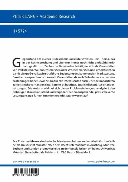 Gegenstand des Buches ist das kommunale Marktwesen - ein Thema, das in der Rechtsprechung und Literatur immer noch nicht endgültig juristisch geklärt ist. Zahlreiche Gemeinden betätigen sich als Veranstalter von Volksfesten, Weihnachtsmärkten oder Wochenmärkten und unterstreichen damit die große volkswirtschaftliche Bedeutung des kommunalen Marktwesens. Daneben versprechen sich sowohl Veranstalter als auch Teilnehmer solcher Veranstaltungen hohe Gewinne. Da für alle Interessenten ausreichende Kapazitäten zumeist nicht vorhanden sind, kommt es häufig zu (gerichtlichen) Auseinandersetzungen. Die Autorin widmet sich diesen Problemstellungen, analysiert den bisherigen Diskussionsstand und zeigt darüber hinausgehende, praxisrelevante Lösungsansätze für ein funktionierendes Marktwesen auf.