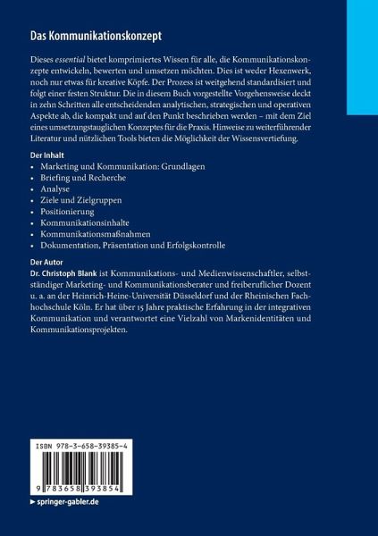 Dieses essential bietet komprimiertes Wissen für alle, die Kommunikationskonzepte entwickeln, bewerten und umsetzen möchten. Dies ist weder Hexenwerk, noch nur etwas für kreative Köpfe. Der Prozess ist weitgehend standardisiert und folgt einer festen Struktur. Die in diesem Buch vorgestellte Vorgehensweise deckt in zehn Schritten alle entscheidenden analytischen, strategischen und operativen Aspekte ab, die kompakt und auf den Punkt beschrieben werden - mit dem Ziel eines umsetzungstauglichen Konzeptes für die Praxis. Hinweise zu weiterführender Literatur und nützlichen Tools bieten die Möglichkeit der Wissensvertiefung.
