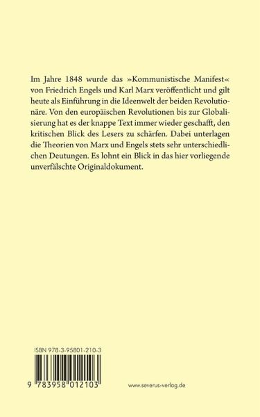 Im Jahre 1848 wurde das "Kommunistische Manifest" von Friedrich Engels und Karl Marx veröffentlicht und gilt heute als Einführung in die Ideenwelt der beiden Revolutionäre. Von den europäischen Revolutionen bis zur Globalisierung hat es der knappe Text immer wieder geschafft, den kritischen Blick des Lesers zu schärfen. Dabei unterlagen die Theorien von Marx und Engels stets sehr unterschiedlichen Deutungen. Es lohnt ein Blick in das hier vorliegende unverfälschte Originaldokument.