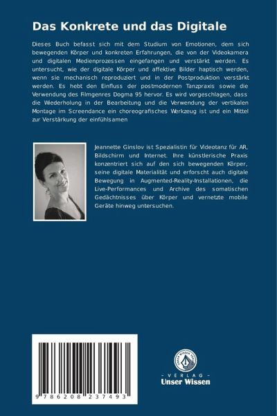 Dieses Buch befasst sich mit dem Studium von Emotionen, dem sich bewegenden Körper und konkreten Erfahrungen, die von der Videokamera und digitalen Medienprozessen eingefangen und verstärkt werden. Es untersucht, wie der digitale Körper und affektive Bilder haptisch werden, wenn sie mechanisch reproduziert und in der Postproduktion verstärkt werden. Es hebt den Einfluss der postmodernen Tanzpraxis sowie die Verwendung des Filmgenres Dogma 95 hervor. Es wird vorgeschlagen, dass die Wiederholung in der Bearbeitung und die Verwendung der vertikalen Montage im Screendance ein choreografisches Werkzeug ist und ein Mittel zur Verstärkung der einfühlsamen