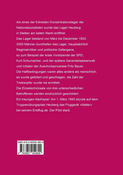 Als eines der frühesten Konzentrationslager der Nationalsozialisten wurde das Lager Heuberg in Stetten am kalten Markt eröffnet. Das Lager bestand von März bis Dezember 1933. 3500 Männer durchliefen das Lager, hauptsächlich Regimekritiker und politische Gefangene, so zum Beispiel der erste Vorsitzende der SPD, Kurt Schumacher, und der spätere Generalstaatsanwalt und Initiator der Auschwitzprozesse Fritz Bauer. Die Haftbedingungen waren alles andere als menschlich; es wurde gefoltert und geschlagen, die Zahl der Todesopfer wurde nie ermittelt. Die Einzelschicksale von drei unterschiedlichen Betroffenen werden eindrücklich geschildert. Ein trauriges Nachspiel: Am 1. März 1945 stürzte auf dem Truppenübungsplatz Heuberg das Fluggerät »Natter« bei seinem Erstflug ab. Der Pilot starb.