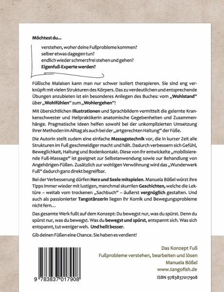 Möchtest du ...... verstehen, woher deine Fußprobleme kommen? ... selber etwas dagegen tun?... endlich wieder schmerzfrei stehen und gehen? ... Eigenfuß-Experte werden?Füßische Malaisen kann man nur schwer isoliert therapieren. Sie sind eng verknüpft mit vielen Strukturen des Körpers. Das zu verdeutlichen und entsprechende Übungen anzubieten ist ein besonderes Anliegen des Buches: vom Wohlstand über Wohlfühlen zum Wohlergehen!Mit übersichtlichen Illustrationen und Sprachbildern vermittelt die gelernte Krankenschwester und Heilpraktikerin anatomische Gegebenheiten und Zusammenhänge. Pragmatische Ideen helfen sowohl bei der unkomplizierten Umsetzung ihrer Methoden im Alltag als auch bei der artgerechten Haltung der Füße.Die Autorin stellt zudem eine einfache Massagetechnik vor, die in kurzer Zeit alle Strukturen im Fuß geschmeidiger macht und hält. Dadurch verbessern sich Gefühl, Beweglichkeit, Haltung und Bodenkontakt. Diese von ihr entwickelte mobilisierende Fuß-Massage ist geeignet zur Selbstanwendung sowie zur Behandlung von Angehörigen-Füßen. Zusätzlich zur wohligen Verwöhnung wird das Wunderwerk Fuß dadurch ganz direkt begreifbar. Bei der Verbesserung dürfen Herz und Seele mitspielen. Manuela Bößel würzt ihre Tipps immer wieder mit lustigen, manchmal skurrilen Geschichten, welche die Lektüre - weitab vom trockenen Sachbuch - äußerst vergnüglich gestalten. Und auch als passionierter Tangotänzerin liegen ihr Komik und Bewegungsprobleme nicht fern ...Das gesamte Werk fußt auf dem Konzept: Du bewegst nur, was du spürst. Denn du spürst nur, was du bewegst. Was du bewegst und spürst, entspannt sich. Was sich entspannt, tut weniger weh. Und heilt besser.Gib deinen Füßen eine Chance. Sie haben es verdient!